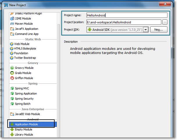 在左下角点击黑色边框内的Android Module,并在右侧pannel中填写Project Name和Project Location,接着最重要的一步就是选择Project的SDK,点击后侧的New,找到刚才解压的SDK路径就好,比如我将要开发一个HelloWorld程序,填写如上。