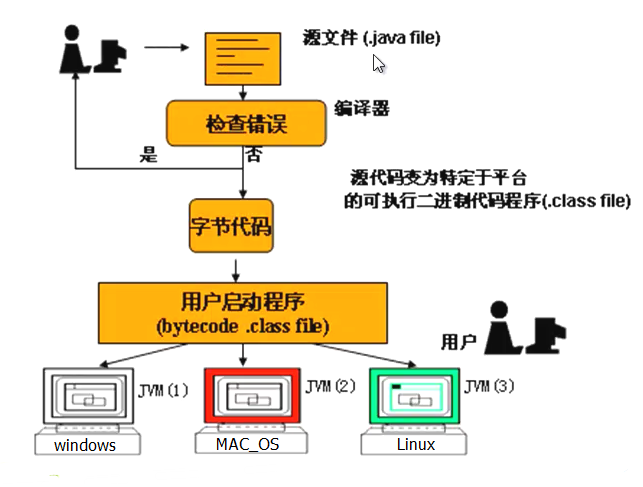 程序员编写java源文件(.java),编译器检查源文件的语法错误,没有错误就编译成字节代码(.class)文件,可在任意的虚拟机上运行。针对不同的操作系统有不同的虚拟机,虚拟机将class文件编译成适合当前操作系统的代码,然后由操作系统交给硬件去执行。两次编译
