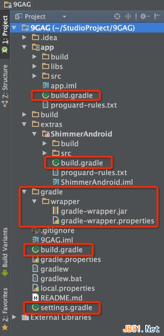 下面就以我的开源项目 9GAG 来详细讲解下和Gradle相关的知识, 和Gradle相关的几个文件一般有如下几个: