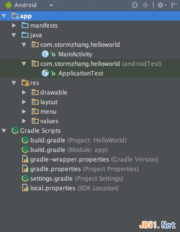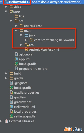 2、上述目录中将java代码和资源文件(图片、布局文件等)全部归结为src,在src目录下有一个main的分组,同时划分出java和res两个文件夹,java文件夹则相当于Eclipse下的src文件夹,res目录结构则一样.