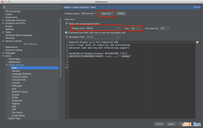 进入后你也许发现字体大小或者样式不符合你的习惯,比如我是觉得代码太小看起来伤眼,Darcular主题默认的字体是12,我个人更习惯14的字体大小。没关系,到 Preferences (设置)页面搜索 Font 找到 Colors&Fonts 下的 Font 选项,我们可以看到默认字体大小是12,但是无法修改,需要先保存才可以修改,点击 Save as 输入一个名字,比如 MyDarcular,然后就可以修改字体大小和字体样式了.