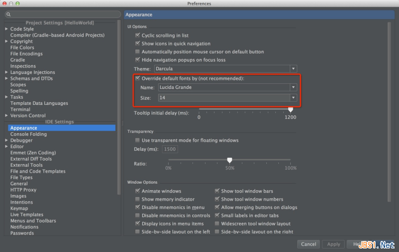 强迫症的你肯定无法忍受,没关系,这里也同样可以设置,到 Preferences -> Appearance 修改如图所示就ok,这里同样不仅可以更改字体大小,也可以选择不同的字体,点击OK,这次页面字体就完全对你胃口了。