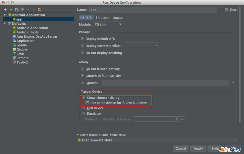 Studio 默认安装会启动模拟器,如果想让安装到真机上可以配置一下。在下拉菜单中选择 Edit Configurations 选择提示或者是USB设备。