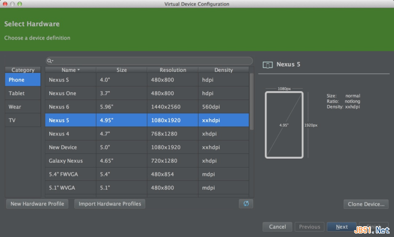选择一个设备,这里我选择 Nexus 5,然后Next