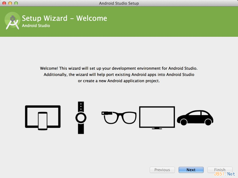 至于安装就没什么可说的了,点击直接运行了。这里我以Mac系统的1.0RC版本为例,来创建第一个HelloWorld项目。其他平台基本上差不多,在这之前假设你已经配置好了JDK和Android SDK环境,并且你是第一次安装Studio。