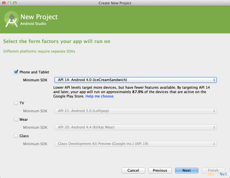 这个页面支持你适配TV、Wear、Glass等,我们只选择第一项就ok,选好最小SDK然后”Next”