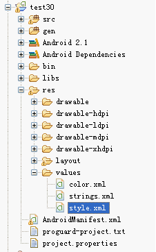 在你的项目中建立一个style.xml文件,文件中的内容当然就是把默认的样式拷贝出来(熟练以后也可以自己写)然后进行一些修改。