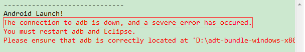 今天在Eclipse中运行Android项目时遇到"The connection to adb is down, and a severe error has occured"这个问题,如下图所示: