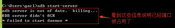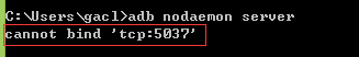 从上面的排查结果显示来看,确实是端口被占用了,接下来需要确定被占用的端口号是多少,输入命令:adb nodaemon server,如下图所示: