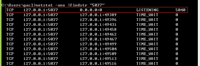在cmd中输入命令netstat -ano |findstr "5037",如下图所示: