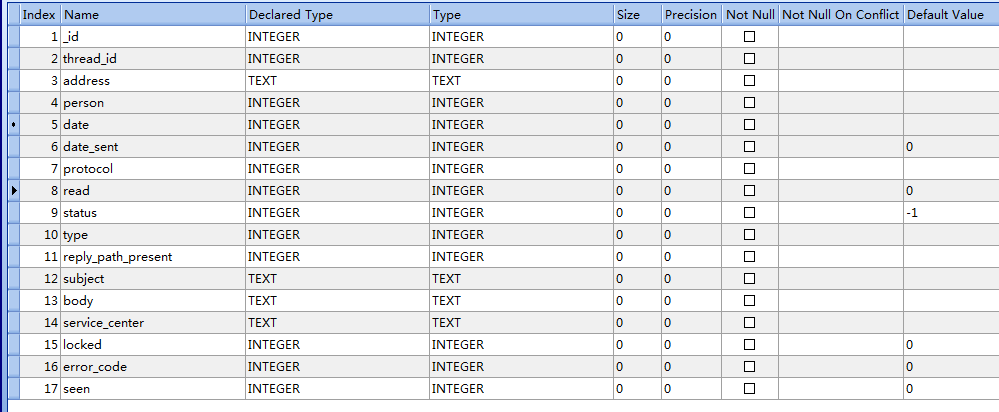 下面来分析一下代码:第一个按钮通过ContentProvider间接获取了一些短信的信息,保存在一个List数组下。我们先导出Android系统的sms表看一下: