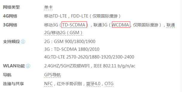 当然,其它厂商:华为、小米、魅族与上面显示的网络类型基本上是一致的。都是3G:TD-SCDMA、WCDMA等