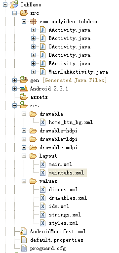 4、 src/com.andyidea.tabdemo包下面各个UI界面类源码: