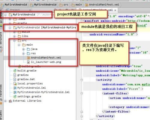 Ps:这里说下这个project,android studio的 这里的project和eclipse中的不一样,这里“new project”相当于创建一个新的workspace工作空间。而module其实就是eclipse所创建的project,刚刚开始使用的可能会不习惯。默认创建