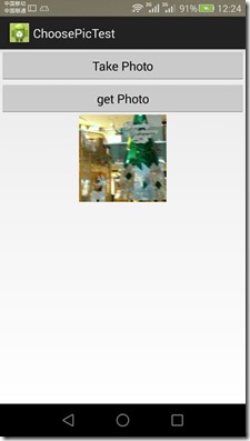 <LinearLayout xmlns:android="http://schemas.android.com/apk/res/android" android:layout_width="match_parent" android:layout_height="match_parent" android:orientation="vertical" > <Button android:id="@+id/take_photo" android:layout_width="match_parent" android:layout_height="wrap_content" android:text="Take Photo" /> <Button android:id="@+id/get_photo" android:layout_width="match_parent" android:layout_height="wrap_content" android:text="get Photo" /> <ImageView android:id="@+id/picture" android:layout_width="wrap_content" android:layout_height="wrap_content" android:layout_gravity="center_horizontal" /> </LinearLayout>