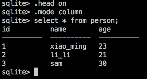 查看起来有些吃力,为了让数据看起来更美观,输入.head on,显示列名,输入.mode column,按类显示