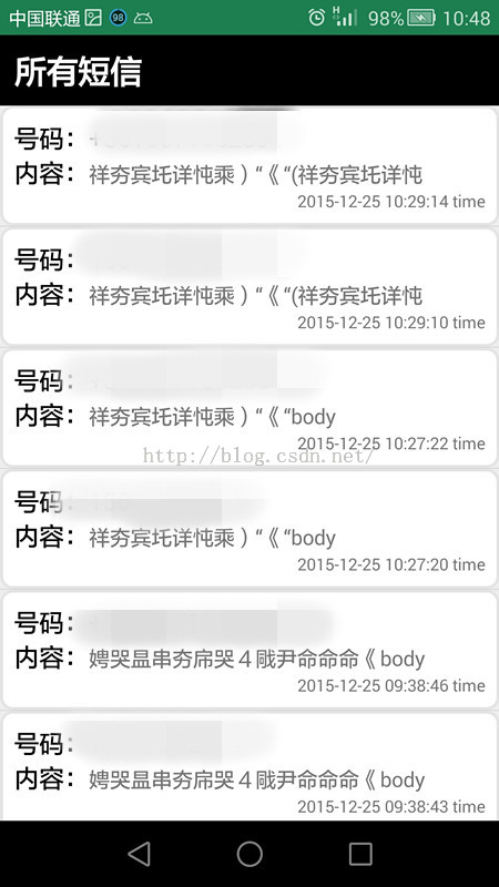 <?xml version="1.0" encoding="utf-8"?> <LinearLayout xmlns:android="http://schemas.android.com/apk/res/android" android:orientation="vertical" android:layout_width="match_parent" android:layout_height="match_parent"> <TextView android:layout_width="match_parent" android:layout_height="wrap_content" android:padding="10dp" android:text="所有短信" android:textColor="#fff" android:background="#000" android:textSize="23sp" android:textStyle="bold"/> <ListView android:id="@+id/list_receive" android:layout_width="match_parent" android:layout_height="match_parent"></ListView> </LinearLayout>