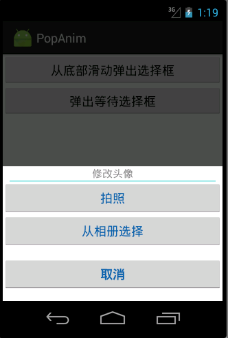 定义要弹出的组件TakePhotoPopWin,它继承自PopupWindow,具体如何实现的,我备注信息很详细了。 有一个地方要提醒的是,就是最后要设置弹出窗体的显示动画,this.setAnimationStyle(R.style.take_photo_anim); 这是必不可少的,只有加上了它,才能应用动画效果!