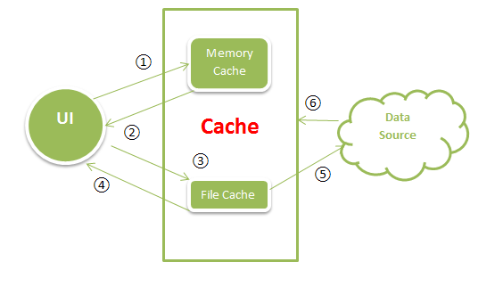 主体有三个,分别是UI,缓存模块和数据源(网络)。它们之间的关系如下: