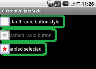 <?xml version="1.0" encoding="utf-8"?> <selector xmlns:android="http://schemas.android.com/apk/res/android"> <item android:state_enabled="true" android:state_checked="true" android:state_pressed="true" android:drawable="@drawable/enabled_on_pressed" /> <item android:state_enabled="true" android:state_checked="false" android:state_pressed="true" android:drawable="@drawable/enabled_off_pressed" /> <item android:state_enabled="true" android:state_checked="true" android:drawable="@drawable/enabled_on" /> <item android:state_enabled="true" android:state_checked="false" android:drawable="@drawable/enabled_off" /> <item android:state_enabled="false" android:state_checked="true" android:drawable="@drawable/disabled_on" /> <item android:state_enabled="false" android:state_checked="false" android:drawable="@drawable/disabled_off" /> </selector>