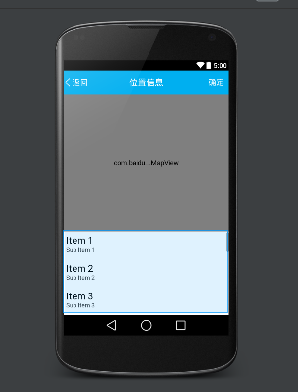 布局文件就是上面是一个百度地图的mapview,下面是一个显示周边位置的ListView,很简单。