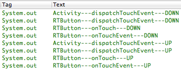 接着,将上述修改还原,让事件在Activity这继续往下分发,接着就分发到了RTButton,将RTButton的dispatchTouchEvent方法的返回值修改为true,重新编译运行并查看输出日志结果。