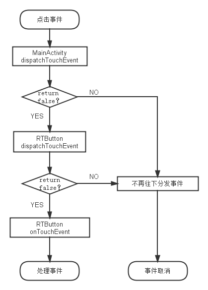 跟分析结果一样,onClick方法并没有被执行,因为事件在RTButton的onTouchEvent方法中被消费了。下图是整个事件传递的流程图。
