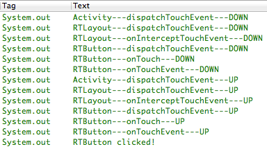 从日志输出结果我们可以看到,嵌套了RTLayout以后,事件传递的顺序变成了Activity->RTLayout->RTButton,这也就回答了前面提出的问题,Android中事件传递是从ViewGroup传递到View的,而不是反过来传递的。