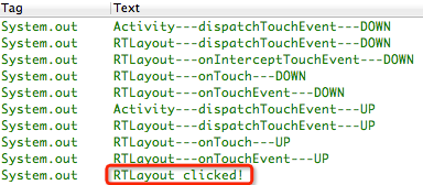 可以看到,我们明明点击的按钮,但输出结果显示RTLayout点击事件被执行了,再通过输出结果分析,对比上次的输出结果,发现本次的输出结果完全没有RTButton的信息,没错,由于onInterceptTouchEvent方法我们返回了true,在这里就将事件拦截了,所以他不会继续分发给RTButton了,反而交给自身的onTouchEvent方法执行了,理所当然,最后执行的就是RTLayout的点击事件了。
