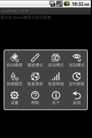 默认样式是在屏幕底部弹出一个菜单,这个菜单我们就叫他选项菜单OptionsMenu,一般情况下,选项菜单最多显示2排每排3个菜单项,这些菜单项有文字有图标,也被称作Icon Menus,如果多于6项,从第六项开始会被隐藏,在第六项会出现一个More里,点击More才出现第六项以及以后的菜单项,这些菜单项也被称作Expanded Menus。下面介绍。