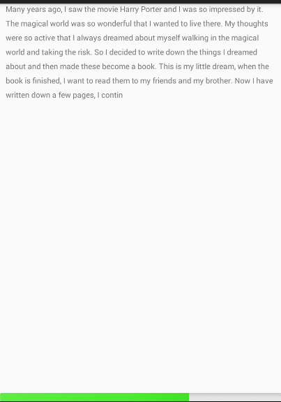 <LinearLayout xmlns:android="http://schemas.android.com/apk/res/android" xmlns:tools="http://schemas.android.com/tools" android:layout_width="match_parent" android:layout_height="match_parent" tools:context="cn.teachcourse.www.MainActivity" android:orientation="vertical" android:gravity="center" > <TextView android:layout_width="match_parent" android:layout_height="wrap_content" android:layout_weight="1" android:id="@+id/read_data_tv" android:text="@string/read_info" android:scrollbars="vertical" android:layout_marginLeft="10dp" android:layout_marginRight="10dp" android:lineSpacingExtra="10dp"/> <ProgressBar android:id="@+id/progressBar_horizontal_read_data" style="?android:attr/progressBarStyleHorizontal" android:layout_width="match_parent" android:layout_height="15dp" android:layout_marginTop="28dp"/> </LinearLayout>