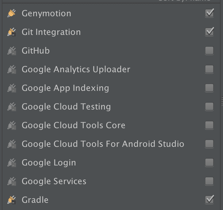 注意到,Android studio会默认给我们安装较多插件,而有一些插件,我们并不需要使用,那么如何提高Android studio的速度,大家可以去除掉一些不必要的插件,就像这样,在此,我去掉了google服务的相关插件,同时,因为Android studio的模拟器运行太慢,我们可以安装Genymotion模拟器,该模拟器在as中有对应的插件,大家可以安装感受下,模拟器带来的便利(至于为什么需要使用模拟器,因为在使用到sqlite的时候,你不必因为你的手机是国产手机无法查看sqlite文件而苦恼,在模拟器上,只需要安装root project,就可快速查看SQLite文件了):