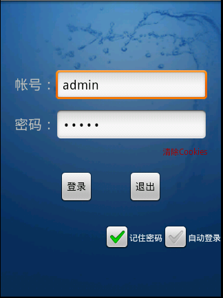 <?xml version="1.0" encoding="utf-8"?> <LinearLayout xmlns:android="http://schemas.android.com/apk/res/android" android:layout_width="fill_parent" android:layout_height="fill_parent" android:gravity="right" android:layout_gravity="right" android:background="@drawable/default_bg" android:orientation="vertical"> <TableLayout android:layout_width="fill_parent" android:layout_height="wrap_content" android:stretchColumns="1"> <TableRow android:gravity="center" android:layout_gravity="center"> <ImageView android:layout_width="fill_parent" android:layout_height="wrap_content" android:id="@+id/ivlogo" > </ImageView> </TableRow> </TableLayout> <TableLayout android:layout_width="fill_parent" android:layout_height="wrap_content" android:stretchColumns="1"> <TableRow android:layout_marginTop="100dip"> <TextView android:layout_width="wrap_content" android:layout_marginLeft="20dip" android:gravity="center_vertical" android:layout_height="wrap_content" android:id="@+id/tvaccount" android:text="帐号:" android:textSize="20sp"> </TextView> <EditText android:layout_width="70px" android:layout_height="wrap_content" android:id="@+id/etaccount" android:layout_marginRight="20dip" android:maxLength="20"></EditText> </TableRow> <TableRow android:layout_marginTop="10dip"> <TextView android:layout_width="wrap_content" android:layout_height="wrap_content" android:id="@+id/tvpw" android:layout_marginLeft="20dip" android:gravity="center_vertical" android:text="密码:" android:textSize="20sp"> </TextView> <EditText android:layout_width="70px" android:layout_height="wrap_content" android:layout_marginRight="20dip" android:id="@+id/etpw" android:inputType="textPassword"></EditText> </TableRow> </TableLayout> <LinearLayout xmlns:android="http://schemas.android.com/apk/res/android" android:layout_width="wrap_content" android:layout_height="wrap_content" android:orientation="horizontal" android:layout_marginTop="5dip" android:layout_marginRight="20dip"> <TextView android:layout_width="wrap_content" android:layout_height="wrap_content" android:id="@+id/tvclear" android:text="清除Cookies" android:textColor="#aa0000" android:textSize="12px"></TextView> </LinearLayout> <TableLayout android:layout_width="fill_parent" android:layout_height="wrap_content" android:layout_marginTop="20dip"> <TableRow android:gravity="center" android:layout_width="fill_parent"> <Button android:layout_width="100px" android:layout_height="wrap_content" android:id="@+id/btnlogin" android:layout_gravity="center" android:text="登录"></Button> <Button android:layout_width="100px" android:layout_height="wrap_content" android:id="@+id/btnexit" android:layout_gravity="center" android:text="退出"></Button> </TableRow> </TableLayout> <LinearLayout xmlns:android="http://schemas.android.com/apk/res/android" android:layout_width="wrap_content" android:layout_height="wrap_content" android:orientation="horizontal" android:layout_marginTop="25dip"> <CheckBox android:layout_width="wrap_content" android:layout_height="wrap_content" android:id="@+id/cbrp" android:text="记住密码" android:textSize="12px"></CheckBox> <CheckBox android:layout_width="wrap_content" android:layout_height="wrap_content" android:id="@+id/cbal" android:text="自动登录" android:textSize="12px"></CheckBox> </LinearLayout> </LinearLayout>