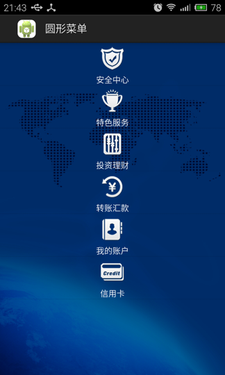 为了更好的显示效果,在布局xml中我们为圆形菜单的上一层以及圆形菜单本书都添加了一个背景图。然后在MainActivity中设置菜单项数据以及点击事件等。代码如下所示 :