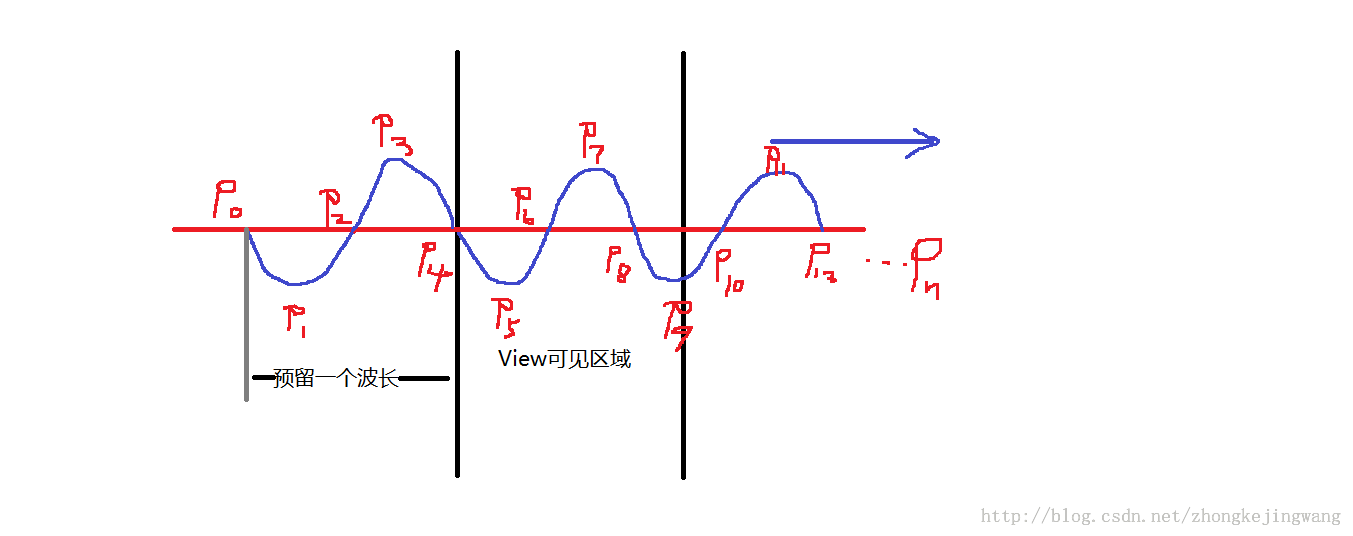 首先在View上根据View宽计算可以容纳几个完整波形,不够一个的算一个,然后在View的不可见处预留一个完整的波形;然后波动开始的时候将所有点同时在x方向上移动相同的距离,这样隐藏的波形就会被平移出来,当平移距离达到一个波长时,这时候将所有点的x坐标又恢复到平移前的值,这样就可以一个波形一个波形地往外传输。用草图表示如下: