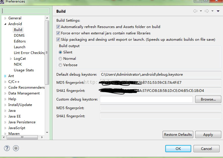 所有的Android应用都必须有数字签名,不存在没有数字签名的应用,包括模拟器运行的。模拟器开发环境,开发时,通过ADB接口上传的程序会自动被签有Debug权限,然后才传递到模拟器。打开Eclipse的Window-->preferences-->Android-->Buid菜单选项如下图,显示的是默认的调试用的签名数字证书。