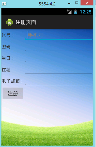 <?xml version="1.0" encoding="utf-8"?> <TableLayout xmlns:android="http://schemas.android.com/apk/res/android" android:layout_width="match_parent" android:layout_height="match_parent" android:stretchColumns="1" android:background="@drawable/bluesky" > <!-- 账号 --> <TableRow> <TextView android:layout_width="match_parent" android:layout_height="wrap_content" android:text="账号:" android:textSize="16sp" /> <EditText android:layout_width="match_parent" android:layout_height="wrap_content" android:hint="手机号" android:selectAllOnFocus="true" /> </TableRow> <!-- 密码 --> <TableRow> <TextView android:layout_width="match_parent" android:layout_height="wrap_content" android:text="密码:" android:textSize="16sp" /> <EditText android:layout_width="match_parent" android:layout_height="wrap_content" android:inputType="numberPassword" /> </TableRow> <!-- 生日 --> <TableRow> <TextView android:layout_width="match_parent" android:layout_height="wrap_content" android:text="生日:" android:textSize="16sp" /> <EditText android:layout_width="match_parent" android:layout_height="wrap_content" android:inputType="date" /> </TableRow> <!-- 住址 --> <TableRow> <TextView android:layout_width="match_parent" android:layout_height="wrap_content" android:text="住址:" android:textSize="16sp" /> <EditText android:layout_width="match_parent" android:layout_height="wrap_content" android:inputType="textPostalAddress" /> </TableRow> <!-- 电子邮箱 --> <TableRow> <TextView android:layout_width="match_parent" android:layout_height="wrap_content" android:text="电子邮箱:" android:textSize="16sp" /> <EditText android:layout_width="match_parent" android:layout_height="wrap_content" android:inputType="textEmailAddress" /> </TableRow> <!-- 注册 --> <TableRow> <Button android:layout_width="match_parent" android:layout_height="wrap_content" android:text="注册" /> </TableRow> </TableLayout>