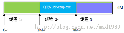 如:文件的长度为6M,线程数为3,那么,每条线程下载的数据长度为2M,每条线程开始下载的位置如下图所示: