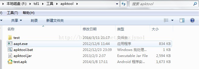 下载上述工具中的apktool,解压得到3个文件:aapt.exe,apktool.bat,apktool.jar ,将需要反编译的APK文件放到该目录下,