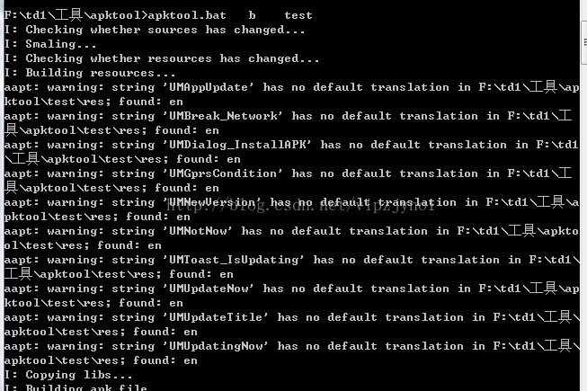 如果你想将反编译完的文件重新打包成apk,那你可以:输入apktool.bat b test(你编译出来文件夹)便可,效果如下: