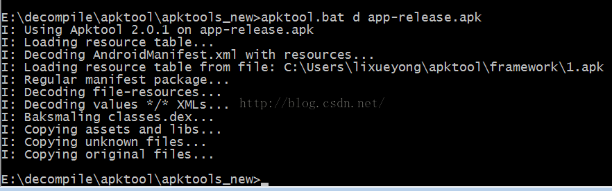 首先我们将apk拷贝到apktool工具目录下,执行命令apktool d app-release.apk。