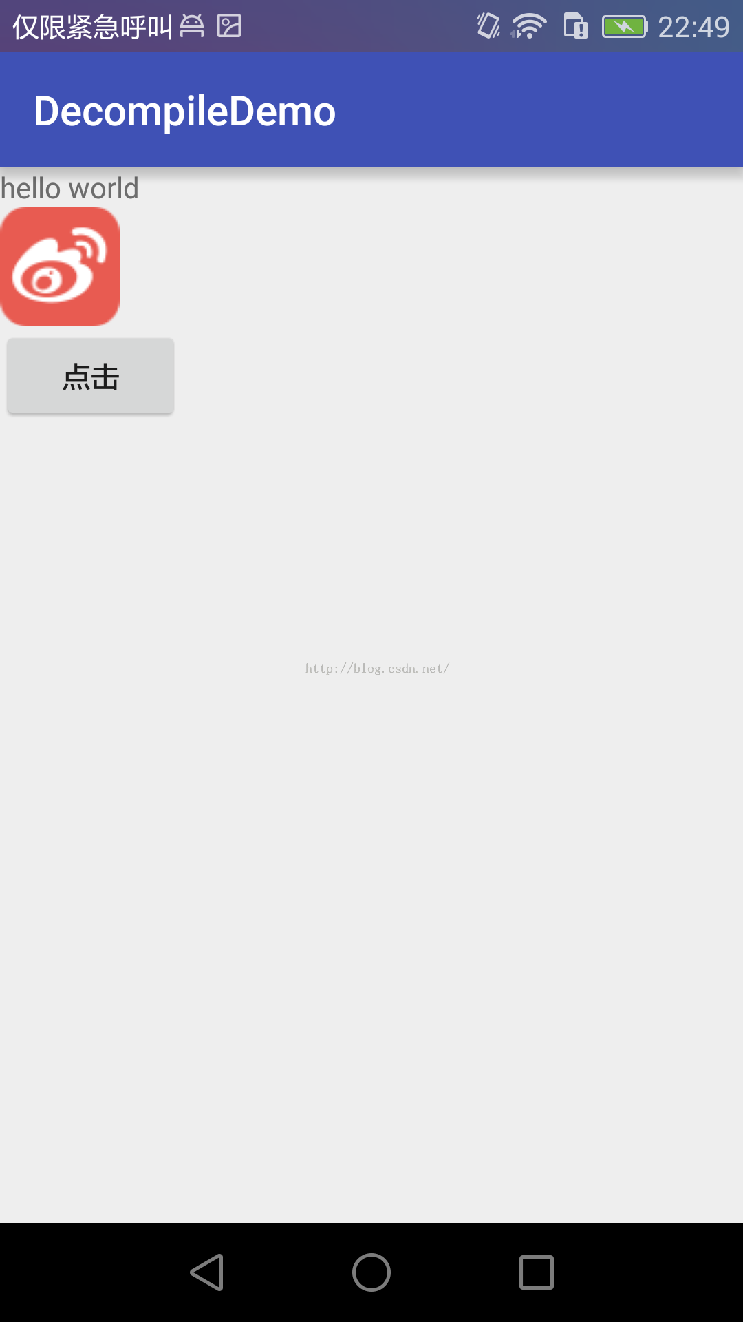 为了尽可能的把问题讲清楚,我们来实现一个很简单的例子。首先创建一个工程DecompileDemo,在MainActivity中定义一个布局,其中包含一个Button,点击会打印一段日志。