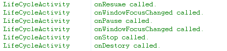 这个方法在某种场合下还是很有用的,例如程序启动时想要获取视特定视图组件的尺寸大小,在onCreate中可能无法取到,因为窗口Window对象还没创建完成,这个时候我们就需要在onWindowFocusChanged里获取;如果大家已经看过我写的Android动画之Frame Animation这篇文章就会知道,当时试图在onCreate里加载frame动画失败的原因就是因为窗口Window对象没有初始化完成,所以最后我将加载动画的代码放到了onWindowFocusChanged中,问题迎刃而解。不过大家也许会有疑惑,为什么我在代码里将它注释掉了,因为对当前Activity每一个操作都有它的执行log,我担心这会影响到整个流程的清晰度,所以将它注掉,大家只要了解它应用的场合和执行的顺序就可以了。