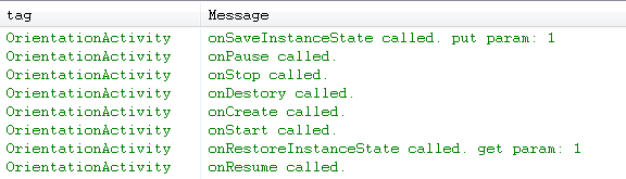 为了避免这样销毁重建的过程,我们需要在AndroidMainfest.xml中对OrientationActivity对应的<activity>配置android:configChanges="orientation",然后我们再测试一下,我试着做了四次的旋转,打印如下: