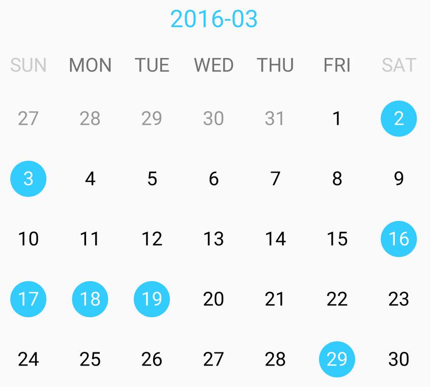 <com.tubb.calendarselector.library.MonthView android:id="@+id/ssMv" android:layout_width="match_parent" android:layout_height="300dp" sc:sc_firstday_week="sunday" sc:sc_draw_monthday_only="false" sc:sc_month="2016-3"/>