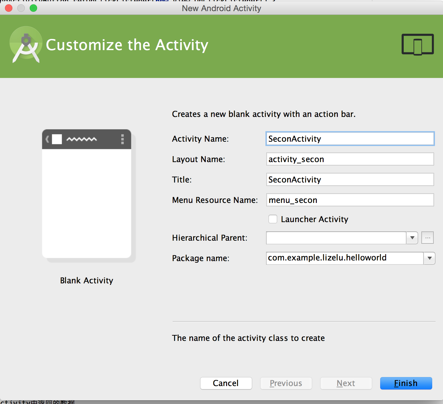 点击完后出现下面的对话框来新建一个Activity,也就是我们自定义的Activity。Activity Name: 活动的名字,Layout Name: 活动对应布局文件的名字,Titile: 上面导航条显示的名字。Menu Resource Name: 菜单的xml配置文件的名称(稍后会详细介绍),点击Finishi即可。