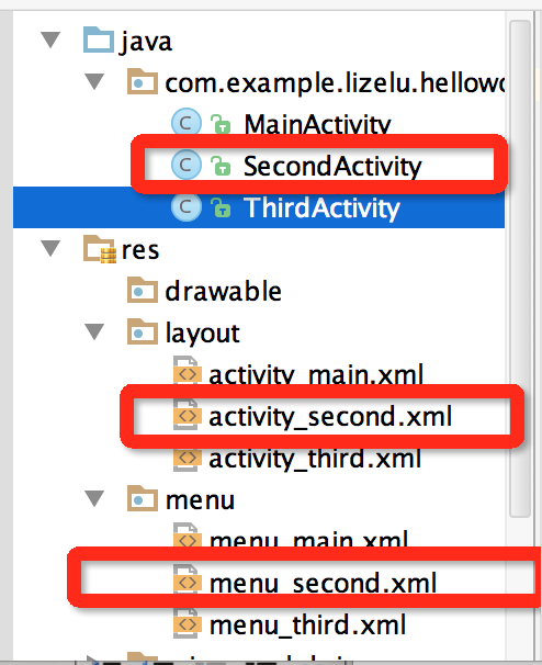 活动创建后会在资源目录中生成三个文件,如下图所示,java中的SecondActivity文件有前面的"C"标志可知,是Java的Class文件,也就是Activity对应的源文件。而Layout文件中的activity_second.xml是Activity对应的布局文件,在布局文件中你可以指定给Activity添加那些控件,并且可以控制这些控件的样式和位置。第三个就是menu下的menu_second.xml文件,该文件是定义导航中的下拉菜单内容的,稍后给大家演示。