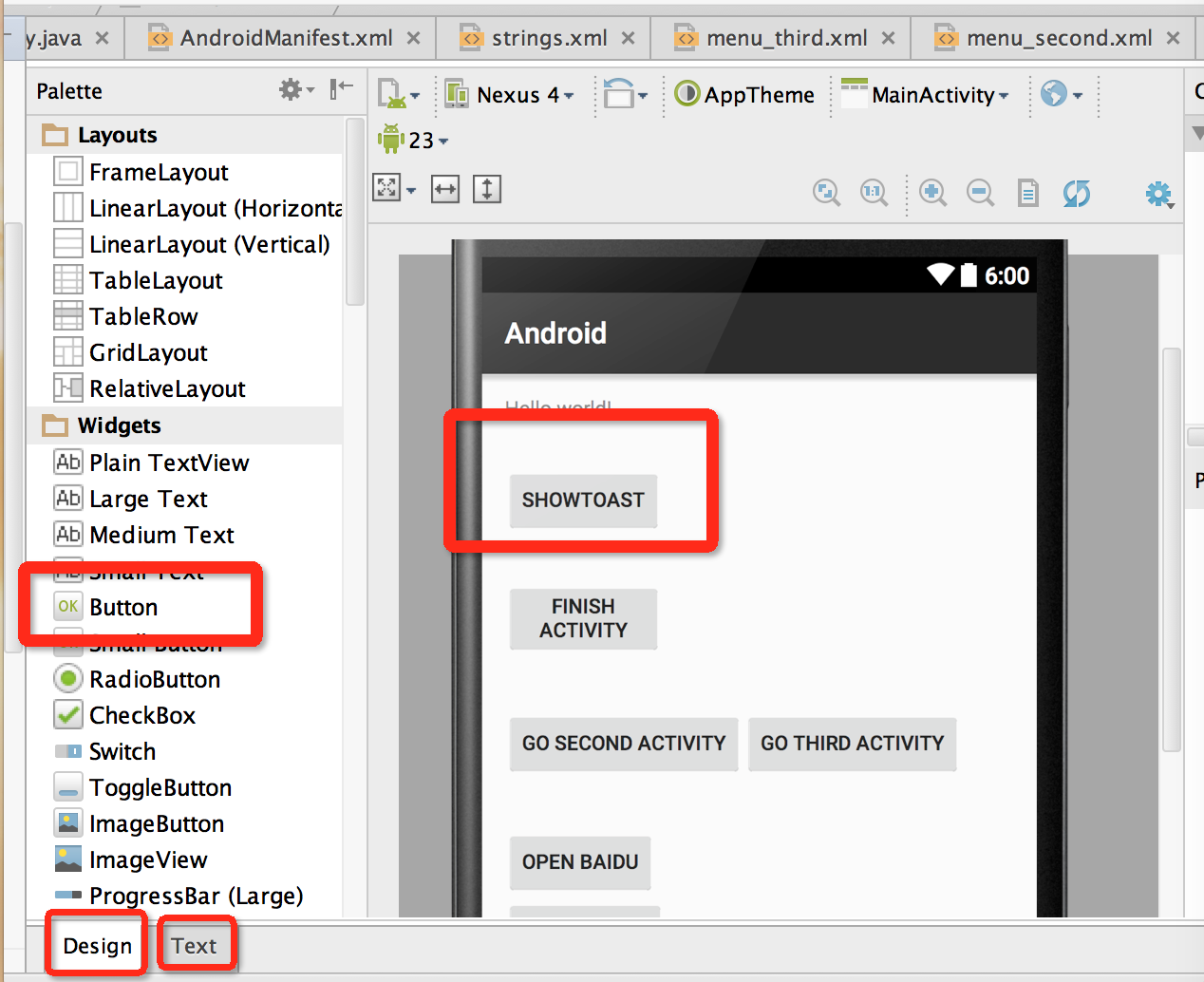 往Activity中添加控件就需要操作我们的Layout文件夹下Activity所对应的xml文件了。接下来要做的事情是在MainActivity中的布局文件中添加一个按钮,然后在代码中获取一个按钮,并且监听按钮的点击事件,按钮点击事件触发后弹出一个提示框。详细的看一下如何去添加控件并监听控件的事件。