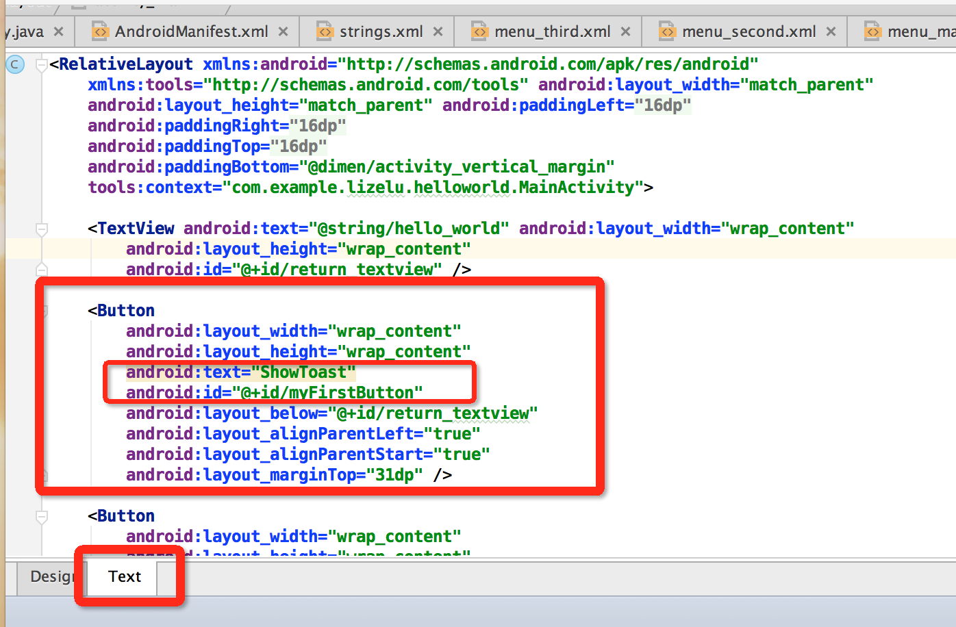 你也可以切换到Text模式下去看xml的文本,下面的大框中就是我们刚才拖拽出来的Button所对应的xml的内容,其中包括与布局有关的信息:控件的宽高,上下左右的边距等,还有控件的一些属性:控件独有的id以及控件显示的文本(Text)等。当然如果对xml布局的属性较为了解,就可以使用纯代码去声明和布局你的控件。