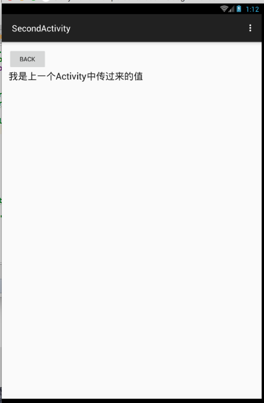 (3) 在新的Activity中我们需要获取传过来的值显示在TextView上,并且点击一个Back按钮返回到上一层Activity,具体代码如下。这些代码是放在第二个Activity的onCreate()方法中的。可以通过getIntent获取是通过那个Intent跳转的,换句话说事获取当前的导航栈。获取Intent对象后,通过getStringExtra()方法传入一个相应的键,通过这个键来获取值。因为我们传入的值是String类型的所以用getStringExtra(), 不同类型的值对应着不同的方法。然后把获取的值显示在TextView上。之后点击Button返回。 Button中的finish()方法是结束当前Activity,就会自动返回上一个Activity。TextView和Button也是通过拖拽的方式来获取的,然后通过id进行事件的处理和赋值。